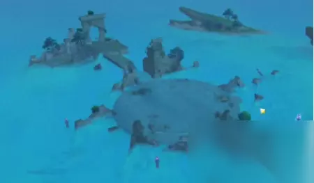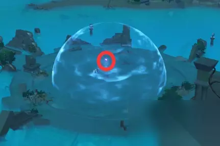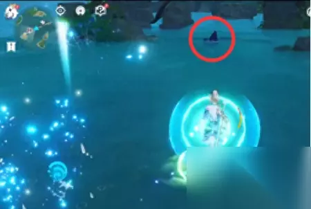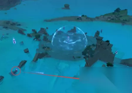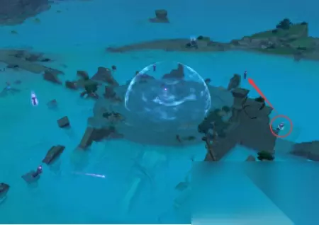 然后我们还是直接看解开了谜题的俯瞰图,然后按照步骤解开这个谜题。 发射子弹的柱子边上是有一个浪船的,在这个区域解密,是需要一直在海里游的,如果你坐上了浪船,除非你“从浪船里出来”(长按跳跃键从浪船里飞出来),否则你是没法儿调整柱子的转向和仰角的。所以到底开不开,取决于你的体力值。 如果风神瞳和岩神瞳没有找齐,导致你的体力条不足以在这么大一块儿海域里游来游去,你可以去制作“北地烟熏鸡”之类补充体力的食物,然后带上一个在这次活动“龙王之邀”就可以获得的北斗,北斗能降低游泳消耗的体力值。 个人建议是没必要开着浪船进进出出,因为柱子的边上是可以站立的。(或者,你有神里绫华。游泳也可以。)