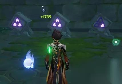 这个机关前面会有三个烦人的小怪,还是我之前教给大家的方法,逮着一个打,打死一个算一个。然后我们来解这个机关。 注意,很有可能你在打小怪的过程之中,命中了这几个机关。不要紧,不管你把它搞成什么牛鬼蛇神,理论上来说只有3x3x3种可能,所以,二十七次之内你肯定能把这个机关解出来。(我直接让钟离竖了根柱子在这三个机关中间,让柱子随缘打打,然后就解开了。) 注意,这个时候,你的背后, 就会刷新出一个宝箱,你顺着宝箱指引的方向继续向前就好。