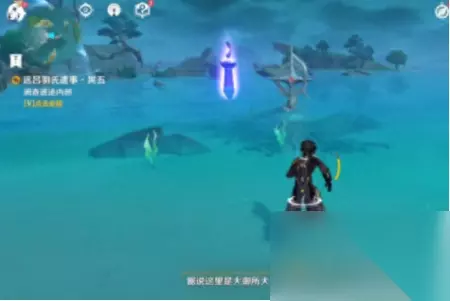 注意,在前面三环任务完成之前,不要到这里来解谜,这里的机关是藏在水下面的。(估计用了和金苹果群岛一样的代码)在没有前面三环时,周围的机关是在的,但是中间拿奖励的地方是消失的,所以就算你跟着这个教程完成了机关的调整,也没有办法拿到奖励。 所以前面三环查漏补缺。 到达如图所示的位置之后,立刻和梶对话,然后,海里的机关才会浮上来。 如果你在海中看到的还是一座断掉的桥,那就是前面三环没完成。 正确的解密场地是中间有一个大圆盘的↓