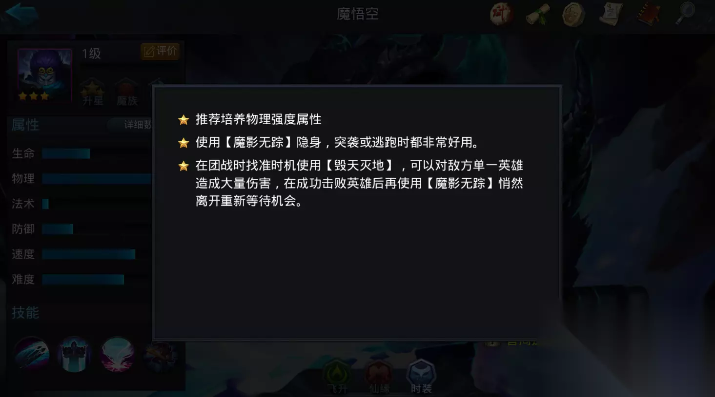 一、影遁奥义,杀招连携 魔悟空的力量核心,在于两大毁天灭地的杀招与神出鬼没的身法: 影遁核心 - 魔影无踪:此乃魔悟空的灵魂所在!身形消散于无形,是发起致命突袭的完美前奏,更是危急关头金蝉脱壳的神技!切记:隐遁非无敌!匿踪期间承受的伤害将激增50%,敌方火力全开时强行隐身硬抗?无异自寻死路! 控场起手 - 灭天绝地:破影而出的雷霆一击!此招蕴含着恐怖的真实伤害,专克残血目标的最后挣扎,是战场收割的无情镰刀。真实伤害无视护甲魔抗,再肉的敌人在你面前也如纸糊! 终结之刃 - 一瞬万杀:灭天绝地控场之后,接踵而至的便是这毁天灭地的终结技!魔影无踪起手 -> 灭天绝地控场 -> 一瞬万杀终结,构成了魔悟空无解的秒杀连招链!三者环环相扣,缺一不可!