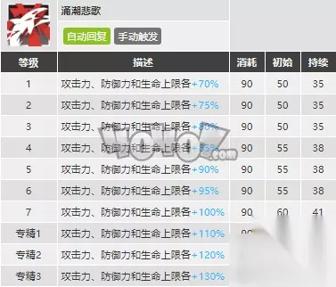 相比于一技能,斯卡蒂的二技能有着很不错的表现。对于一个没有资源精二干员的新手玩家来说,携带二技能的斯卡蒂将会是精一阶段性价比最高的六星干员之一,因此如果你是一个新手玩家,又抽到了斯卡蒂,那么至少在整个精一阶段她都会是一个相当可靠的打手。 斯卡蒂二技能的理论伤害能够达到2992,毫无疑问这是一个相当夸张的输出,单论数值的话几乎能够碾压绝大部分的物理输出干员了,而在现在的环境中斯卡蒂而二技能成功的挽救了她本来没什么用的天赋二,顺带也研究出了斯卡蒂的新用法。 二技能落地点火的效果使得斯卡蒂能够在落地后最长30秒的时间里维持一个相当夸张的输出,这使得她能够作为一个合格的切人单位来使用,面对对方难以对付的精英或者BOSS单位斯卡蒂能够与快活特种,陈等干员一同对其进行针对性的攻击,从而最大限度的发挥出二技能的高输出效果。 专精建议:专一即可 涌潮悲歌(三技能)