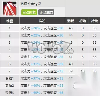 斯卡蒂的潜能中比较重要的是四潜的攻击力加成和五潜的天赋一加成,这两个加成都能够可观的提升斯卡蒂的攻击能力,因此如果想要练斯卡蒂的话可以试试堆到五潜。 技能 迅捷打击·γ型(一技能)