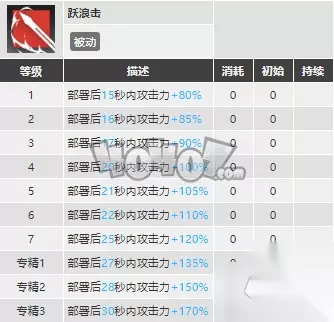 通用技能,特点是在提升攻击力的同时会提升干员的攻击速度,对于斯卡蒂来说该技能带来的加成能够在一定程度上提升其在盾前的输出能力,但是对比其他的六星或者五星近卫干员的出现斯卡蒂由于其较差的生存能力导致携带一技能的斯卡蒂并不是很适合盾前输出的位置。另一方面作为一个通用技能该技能也并没有对斯卡蒂进行有针对性的设计,使得在很多时候并不是很适合使用。综合来说,作为一个通用技能迅捷打击·γ型确实是合格的,但是并不优秀,也没有为其投入过多精力的价值。 专精建议:七级 跃浪击(二技能)