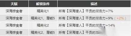 斯卡蒂的天赋一是一个相当尴尬的天赋,理论上来说这是一个有阵营限制的光环效果,这么来说的最好16%的加成其实是一个不错的效果,但是问题就出现在了阵营限制上,斯卡蒂的天赋一仅仅会对深海猎人阵营的干员生效,那么截止到现在《明日方舟》中深海猎人阵营有几位干员呢?安哲拉,斯卡蒂,幽灵鲨,没了。 是的,深海猎人这一阵营仅有三名干员,这使得斯卡蒂的天赋一几乎成为了一个仅有她自己能够吃到的加成效果,而毫无疑问这大幅度降低了斯卡蒂天赋一的适用性,虽然16%的加成依旧不能说不好,但对于斯卡蒂来说比起叠更高的输出确实是提供一些其他效果会更加实际。 天赋二