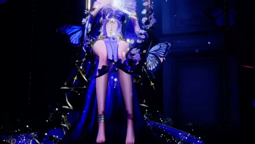 这是手游《以闪亮之名》的情报分享,展示了一款免费获取的六星古风服饰,该服饰以紫黑配色为主,细节精致,裙尾开叉设计还增添了独特风格,玩家玩得久就能拿到这款服饰。