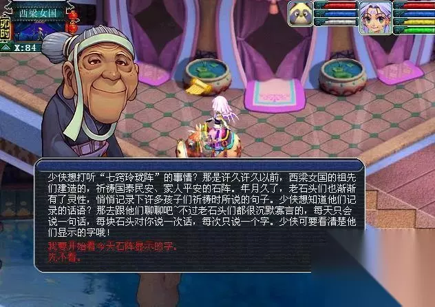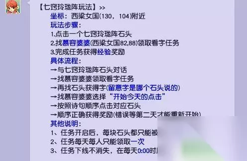 1.“七窍玲珑阵”阵内七块石头每块每天会分别显示一个字,玩家点击任意一块石头后。可找慕容婆婆开始当天的观看“字”任务;