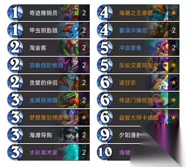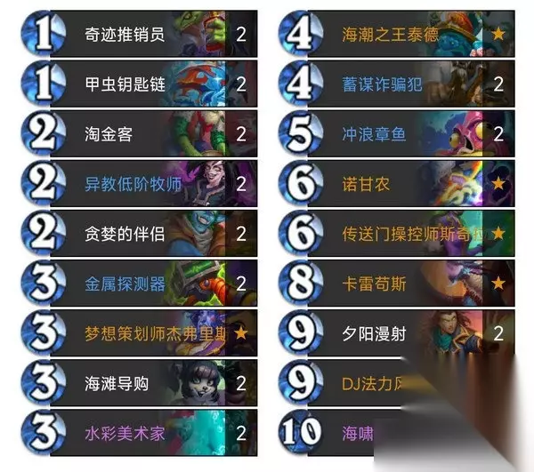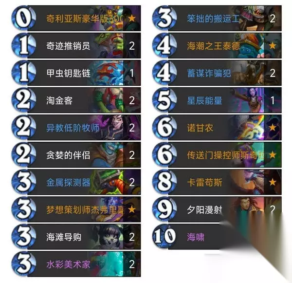 4费跳币冲浪章鱼,5费海滩导购,6费时正好抽到一张夕阳漫射,随缘启动成功,再上卡雷苟斯,又战吼出一张夕阳漫射,0费打出夕阳漫射,一回合用出两张大法术,又正好都拉出1067机器人,当我结束回合后,对面只剩3滴血了……交一个大乱斗后直接投了…… 这里有一个注意事项,就是当你想用卡雷苟斯启动时,在使用卡雷苟斯之前最好不要使用幸运币,因为一旦使用幸运币,卡雷苟斯即使上场,当回合大法术也不会减费了(被幸运币占用名额了,使用幸运币也算使用法术) DJ法力风暴原理和卡雷苟斯同理,增加了一种启动方式,DJ法力风暴可以跳币使用,不过不能像卡雷苟斯那样“无大法术启动”,如果手牌中没有大法术,请不要上DJ法力风暴 大法术法详解什么是大法术法? 以大法术为核心、以低费使用大法术为目标的卡组被称为大法术法 什么是大法术? 在这三套卡组中,9费夕阳漫社、10费海啸被称作大法术 大法术法该如何启动? 启动方式有很多种,常见启动方式如下 1、水彩美术家单核启动,无幸运币7费时启动,有幸运币6费时启动 2、4费时上海潮之王泰德+5费时放大法术,5费启动,这种启动方式要注意内战,如果你是先手,可以这样启动,后手最好别这样做,因为可能对手会在你之前“蹭海潮”启动 3、5费时上冲浪章鱼+6费时上水彩美术家,6费启动,有幸运币可以提前启动 4、5费时上海滩导购+6费时上卡雷苟斯,6费启动 5、6费时上海滩导购+7费时上DJ法力风暴,7费启动,有幸运币可以提前启动 6、6费时上传送门操控师,6费启动,前提条件是手中同时有幸运币和大法术 还有一些其它的启动方式,大部分和海滩导购有关,比如后手2费时跳币上海滩导购+3费时上海滩导购+4费时上卡雷苟斯,4费启动,再比如后手2费时跳币上海滩导购+3费时上冲浪章鱼+4费时上水彩美术家,同样4费启动,这里大家以后在使用时就知道了,就不一一列举了……