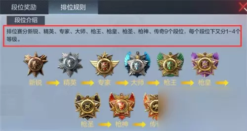 在穿越火线枪战王者手游当中很多玩家还不清楚这个游戏玩法和技巧是什么。关于这个小编已经帮大家准备好了相关内容,希望可以帮助到大家,快来和小编一起来看看吧!本文共计327个文字,预计阅读时间需要49秒。 穿越火线枪战王者有哪些段位 排位等级由低至高顺序: 新锐、精英、专家、大师、枪王、枪皇、枪圣、枪神、传奇,一共有九个段位,每个段位又可以分为1-4个等级。