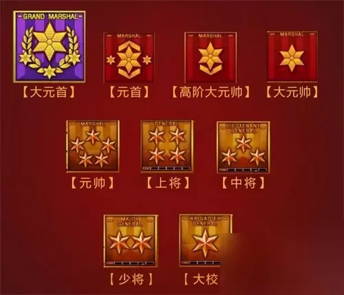 校官级:少校8级、中校8级、上校8级、大校6级,如大校1、大校2等。 将军级:少将6级、中将6级、上将6级,如上将1、上将2等。 元帅级:大元帅、高阶大元帅、元首。(元帅级别是根据荣誉点来评判的) 以上就是小编为大家带来的'穿越火线枪战王者'相关攻略啦,希望能够给大家带来帮助! 更多好玩精彩的攻略欢迎关注233乐园