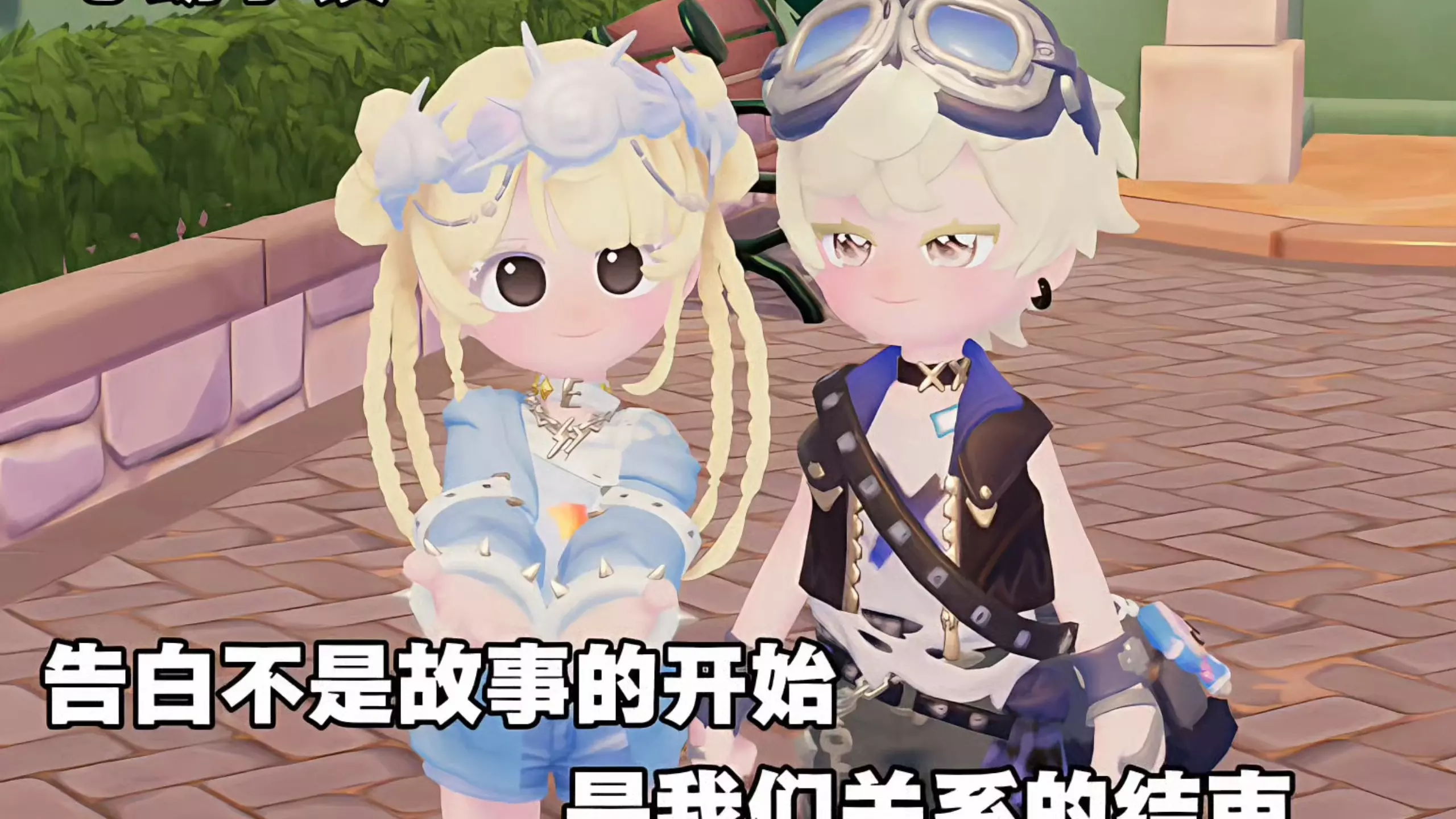 这是游戏《千恋*万花》的剧情截图,展示了角色小春害羞向将臣告白,将臣回应告白的甜蜜片段,发帖人表达了对小春的喜爱。