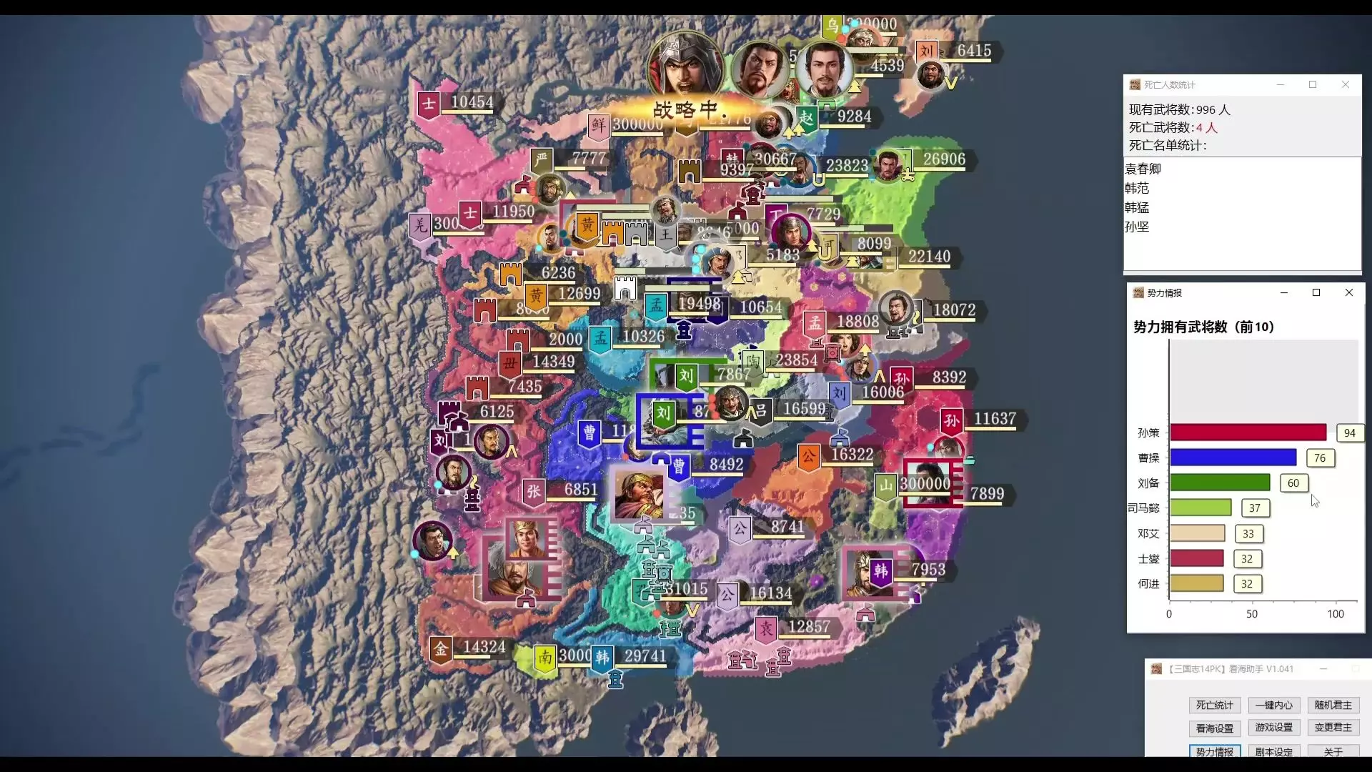 三国志14看海(也就是玩家不操作,完全看这些势力自己打),感觉比玩家手操要有意思。随便选一个势力,然后点右上角设置里面的自动操作,就能进入看海模式,但是玩家最初选择的势力会浪费掉第一回合。 这次讲了讲这个玩法中,我个人的一些观察和心得体会。比如哪些势力会屯兵和基建,成为难啃的骨头;哪些势力是很好的大礼包,能为偏科的其他势力补足所需要的东西;哪些城池的隐藏武将多;御三家在不同的地点分别有什么表现等等。 喜欢看海玩法的可以试试我视频里弄的几个势力分布图,以免每次都是御三家获胜。没玩过看海的可以试试这个玩法。
