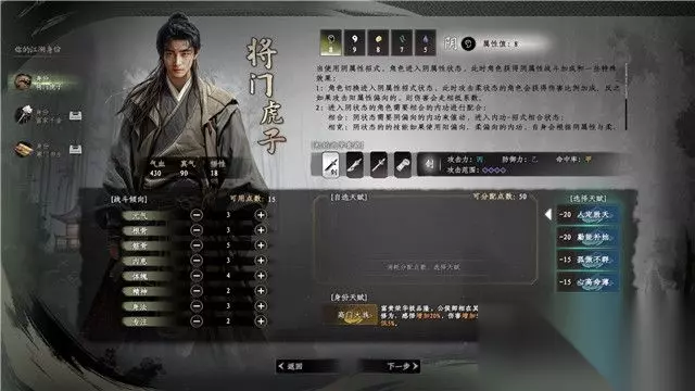 除此之外,你还可以添加角色的属性。 你将初始拥有50点的天赋分配,不过你可以添加“负值”天赋来提升天赋总数,从而换取各种强力的“正数”天赋。