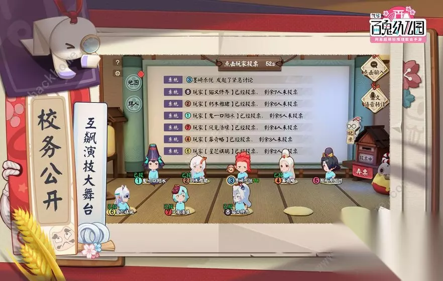 2.萤草老师出击相当于狼队多了一些玩法,一定程度规避分组做任务的场外玩法。 3.彩蛋设计和任务设计。结合阴阳师IP对任务和场景进行包装,是非常讨喜的,个人接受度比较高,不会出现一些任务不知道是干嘛的情况存在,还有类似可以躲进胧车的小设计很有意思。 4.讨论界面比较清爽直观。游戏讨论界面所有玩家以式神形象排排坐,可以很清楚地看到发言情况,而且还有地图标记和投票记录功能,极大地优化了游戏体验,这点是最吸引我的地方。
