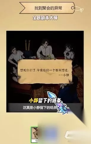 同学聚会通关攻略 1、全民剧本大师同学聚会,首先点击蜡烛下的报纸、地上的信封