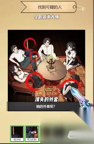 3、接着要找到可疑的人,点击棒球棍、带泥的鞋、衣服潮湿、钻石项链、外套消失