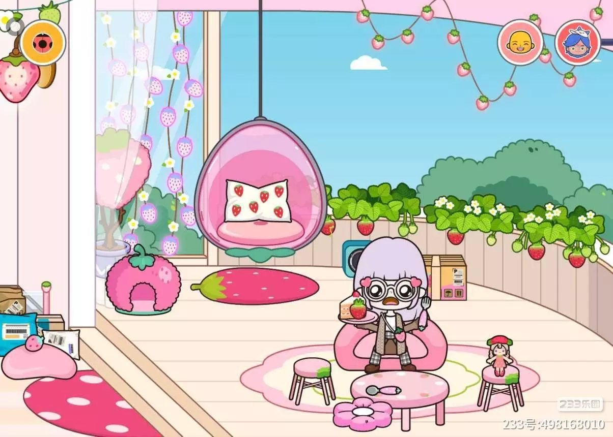 紫色中长发,白色眼镜加上粉丝心形装饰,简直是这副眼镜的灵魂!编织棕色毛衣,很符合秋天该穿的!草莓斜挎包 黑白色格纹长裤,很休闲!棕色小皮鞋小巧又精致!惊恐表情,非常可爱