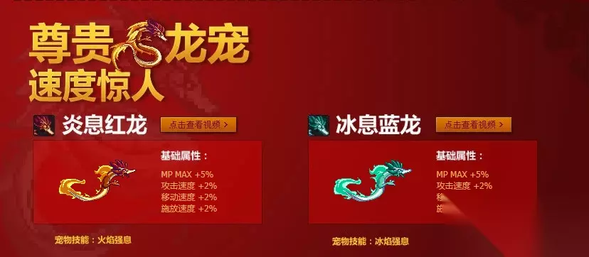 2010年的至尊礼包里,游戏首次加入了贺岁宠物。冰系蓝龙和炎系红龙光看起来十分霸气。这也是官方唯一一次以龙为原型制作的宠物。虽说它们的属性放到现在看肯定是入不了法眼,不过当时角色们的基础属性很低,再加上全民PK的氛围,光是增加2%的三速就已经十分逆天了。 2011年贺岁礼包宠物——兔精灵卫队长、兔精灵战士