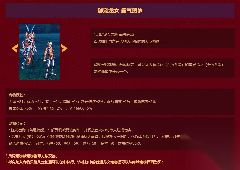这一年的贺岁礼包也是分成了199、359、399三档,不过后两档的宠物又开始拉开了差距。狂战·赤血龙女是第一个增加暴击伤害年宠。她的技能可以召唤一把雷龙偃月刀斩击敌人,并增加50的四维。由于造型十分性感,在当时的讨论度也很高。