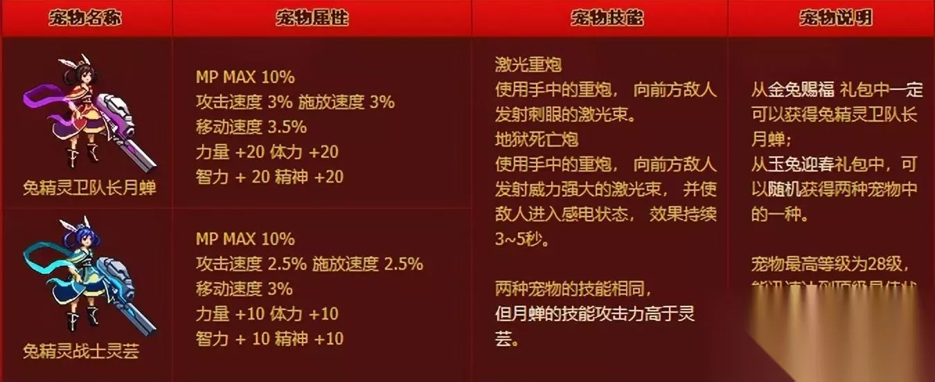 可能是前一年的礼包销量不错,这次礼包干脆分成了三档进行销售,只有装扮的198档,有一般宠物的388档,和有至尊宠物的688档。兔精灵卫队长月婵、兔精灵战士灵芸可以使用激光炮进行攻击,同时附加感电效果,对于刷图来说还是很有帮助的。 2012年贺岁礼包宠物——全职业迷你宠物