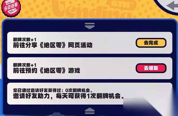 绝区零预抽卡机会怎么获得 1、首先可以分享绝区零的网页活动来获得一个翻牌的次数。 2、接着去预约绝区零的游戏也可以获得一个翻牌次数。 3、或者去邀请好友进行助力,每天都可以获得一次翻牌的机会。 4、在首次参与该活动的时候也可以获得一次翻牌次数。 5、登录游戏,即可完成每日登录的活动来得到两次翻牌次数。