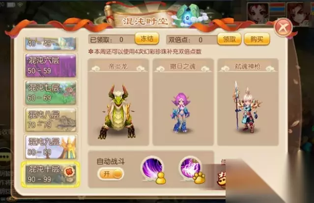 3、双倍点的合理运用 每日玩家都会获得100的双倍点,并且玩家每周还可使用4次双倍珍珠来增加双倍点。不过如何使用双倍点可是一门学问!众所周知双倍点主要用于日常镇妖中,不过由于该活动的经验呈增长趋势,也就导致每轮后5次的经验要比前5次高很多,所以我们在做镇妖时前可以在每轮的后5次中开启双倍,这样就能将双倍点的效益最大化了。
