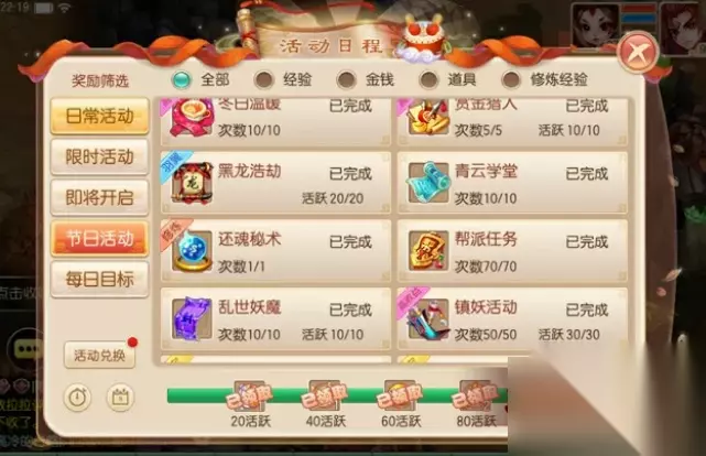 5、晚间活动 帮派赛跑可以说是玩家不可缺席的每日活动,当该活动开启时玩家在帮派地图里每分钟都会获得大量经验,并且参与压注之后无论猜中与否都将获得经验奖励。至于决战九霄活动玩家在完成之后还可以求助其余未完成的玩家将自己拉进10层挂机,毕竟十层中每分钟奖励的经验还是很可观的!