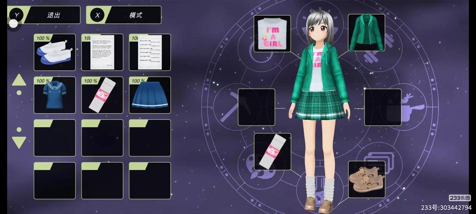 (在学校的时候会穿校服,在玩家打工时来到便利店外,穿着白色上衣,绿色长袖外套以及绿色格子裙)