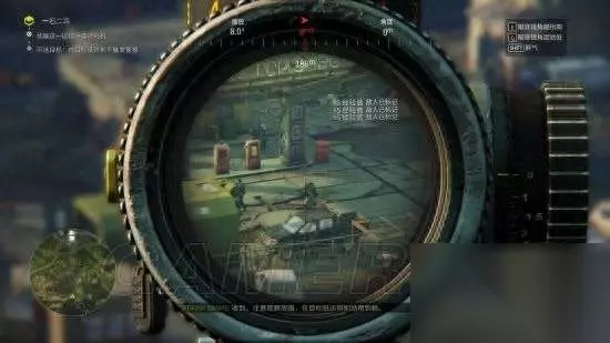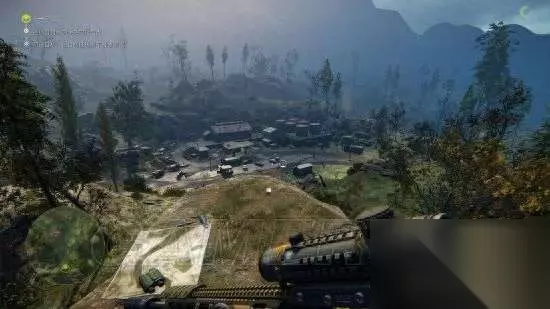 来到制高点 此时我们可以选择击杀此据点的其他哨兵,不过比较危险;也可以听取指示原地等待目标的出现,目标会从地图右侧驾车出现,等待下车以后抓准时机击毙即可。 需要注意的是: 1.由于目标是两个,必须短时间内迅速解决,否则另一个目标会警觉隐蔽起来,这就会比较难办了,无法继续在原地狙击,需要你潜入据点,难度系数就会大大增加。 2.如果你是新手,秒准的时候尽量按住shift屏息减少目镜的晃动,否则很容易射偏。