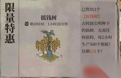 江南百景图摇钱树有什么用 1、摇钱树可以产出铜钱。 2、摇钱树可以在每两个小时内生产五百个铜板。 3、在游戏中玩家铜钱是非常重要的货币,建设城市需要玩家拥有铜币。 江南百景图摇钱树怎么获得 1、玩家在开服的时候是可以免费领取摇钱树的,但是这个活动目前已经结束,不排除后期再上。 2、玩家可以花费45元rmb买一个摇钱树。 以上就是小编为大家带来的江南百景图摇钱树作用介绍。