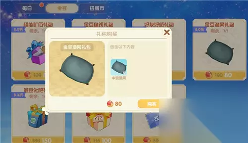 用80金豆就能购买10个渔网道具,相当于一个渔网价格为8金豆,换算成人民币也就是8毛钱。