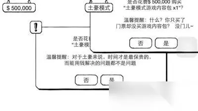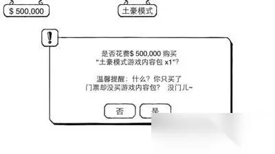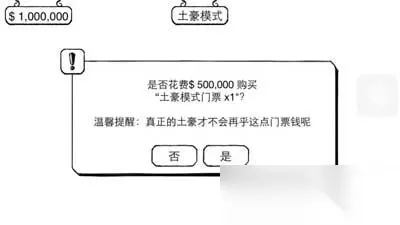 进入土豪模式之后,会让你买门票。游戏给了1,000,000,门票就要5,000,000,直接就去了一半了。不过不买也不让过的样子,所以还是买了吧。