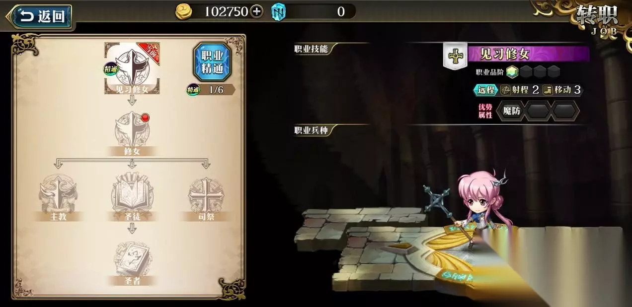 转职之后就会获得相应的属性加成。 稀有度和转职树: 游戏中N到SSR稀有度各不相同,不同稀有度的英雄,转职树也有区别。 稀有度为R的英雄,3条转职路线中有1条可转职至高级职业,5种职业可选(初始+3个中级职业+1个高级职业) 大部分稀有度为SR的英雄,有5种职业可选(初始+3个中级职业+2个高级职业)但主角队与某些特殊角色拥有更多种职业转职 稀有度为SSR的英雄,3条转职路线中有两条可以转职至高级职业,6种职业可选(初始+3个中级+2个高级)。 转职路线变更: 转职路线不是一尘不变的,可以进行更改,每次更改转职路线需要消耗1颗魔导石。
