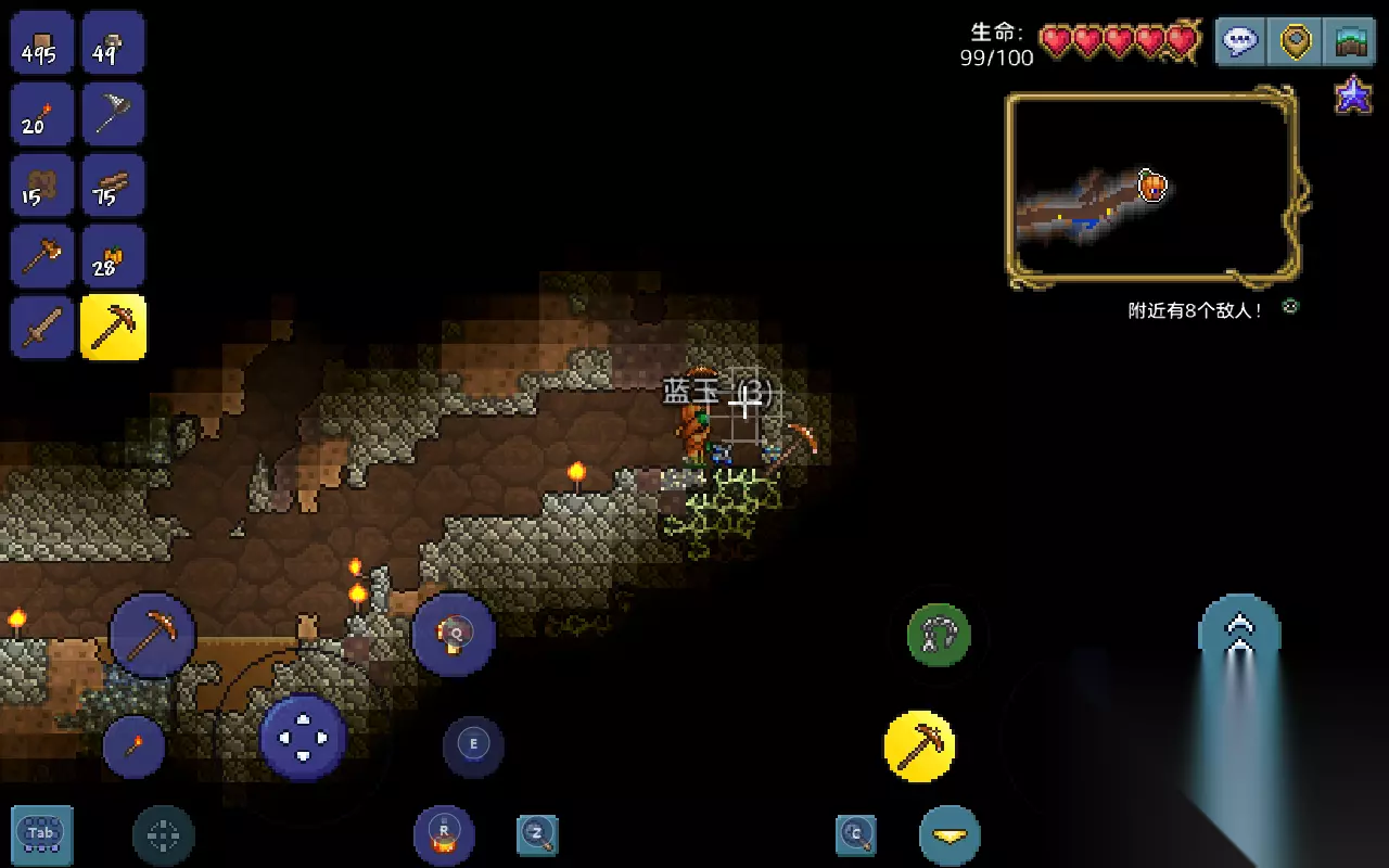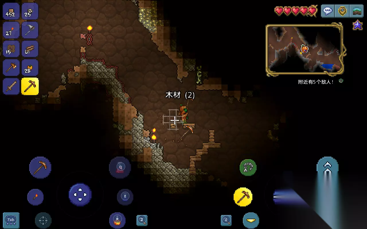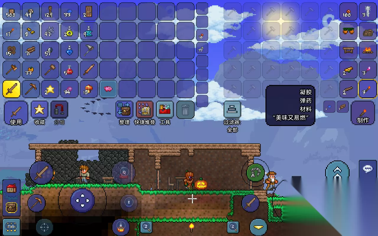 照明工具:在深入地下之前,可以先对道具做一下准备,首先火把是必备的,材料是打史莱姆掉落的凝胶与砍树获得的木材,建议至少先准备个几十把。