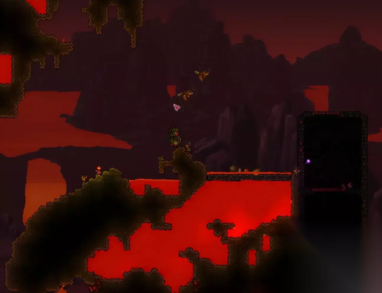 地狱:在地下的最深层是地狱,也是这游戏新手向老手转变的重要区域,要在这里畅行至少需要装备黑曜石头“盔”以及准备好几瓶黑曜石皮肤药剂,接着慢慢挖出狱岩石做熔岩套,这样就能很轻松的抵挡灼热了。 这里也有着极为强力的boss肉山,在击败它之后整个世界会发生变化,增加大量怪物,新boss等等,全新的世界将会向玩家展开。 探索地下