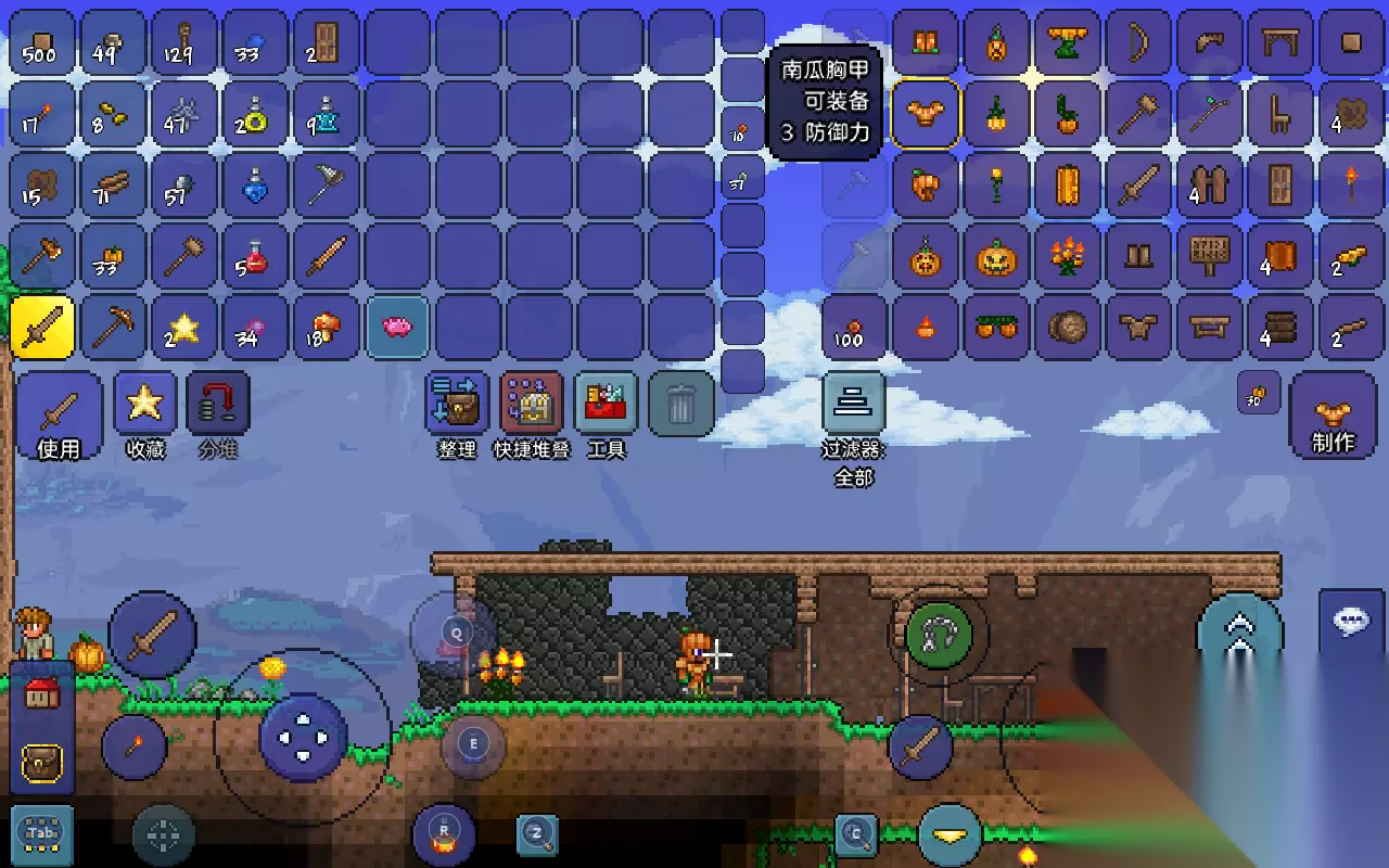 装备:接着是造几件装备提升下角色的防御力,在幽暗的地下随时可能跑出怪物突袭,一个不小心可能就会阵亡了。 最简单的装备是木材制作的木类防具,再好点就是南瓜装备了,建议在地表多采集一些南瓜。另外对于中核或以上玩家,建议先把大部分材料存在箱子或猪猪储蓄罐里,避免死亡时掉落,软核的存下钱就好。 不同地形下方洞穴资源不同