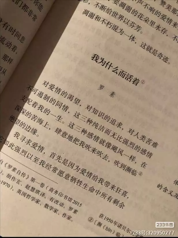 对爱情的渴望,对知识的追求,对人类苦难不可遏制的同情,这三种纯洁而无比强烈的感情支配着我的一生。#我为什么而活着#罗素 第一个是我自己拍的,第二个是网上的