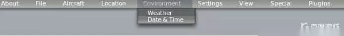 菜鸟飞行当然就要选择晴空万里无云,进入天气设置菜单,鼠标移动到窗口(或屏幕)最上方,就会自动弹出菜单,如下图。