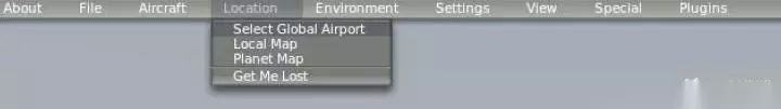 菜鸟入门机场建议选择新加坡,因为对于菜鸟飞行来说,一切都靠一双眼睛看,而尽可能少地摆弄仪表,所以飞行距离不能太长。在新加坡这个小岛上除了熟悉的樟宜国际机场以外,还有其它5个机场(樟宜军用机场就在国际机场边上,也单独算一个),总计有7条跑道,在X-Plane10的场景中都有。 菜鸟飞行时,不用飞太远就可以找到另外一个机场降落,还可以反复在几个机场中间飞来飞去,完全可以基于目视导航的方式进行飞行,不需要复杂的仪表导航就可以练习最基本的起飞,飞行基本控制和目视降落,空中时间长短也比较合适(实际大约飞10分钟就能找到另外一个机场),这样不会太无聊。另外国内的上海浦东机场/上海虹桥也是不错的选择。鼠标移动到窗口(或屏幕)最上方,就会自动弹出菜单,如下图。