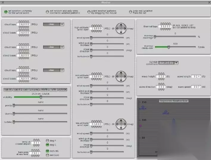 选择“Environment”—>”Weather”,弹出天气设置窗口,如下图。在最上面一排4个选项中选择第一个“Set Weather uniformly for the whole world”,然后按照上图逐一对照选择,所有东西尽可能选择Clear或者Clear and Dry。能见度部分Visibility一定要选择Cavok或者把数字调到最大。4个选项中的最后一项是“Grab real weather from the net”,是指从网络上下载所选机场当地的实际气象状况,这个是熟练飞行之后才会作为默认选项的。