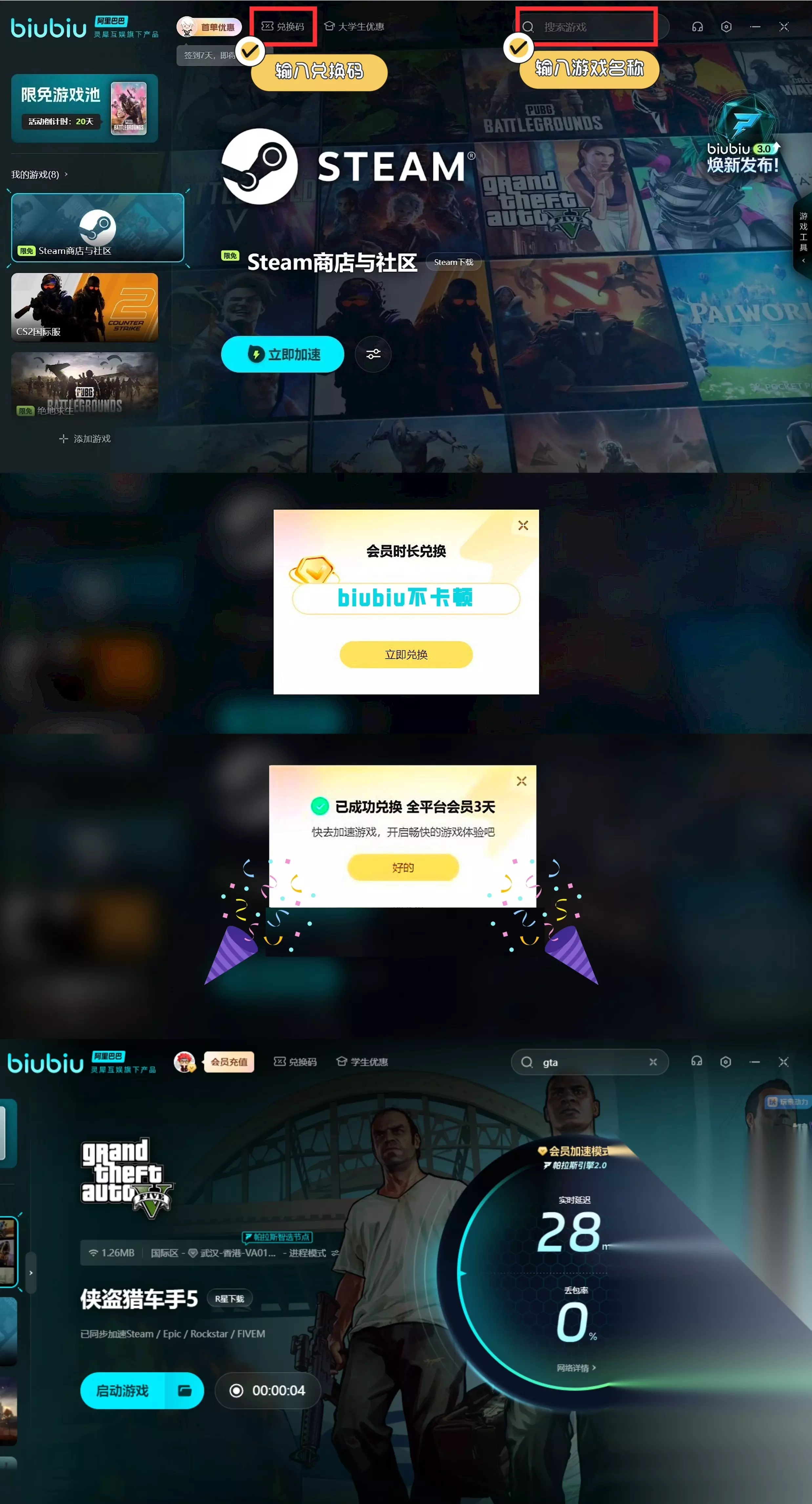 【biubiu加速器】最新版下载 点击下载 GTA5在蒸汽平台上的名字全称是Grand theft auto v,只有搜这个名称才可以搜出来游戏,注意勾选已满18岁的一个年龄阶段,由于涉及不少了暴力和犯罪题材是不允许未成年人购买的。该作品的优化并且推出的DC扩展包内容都是非常不错的,电脑设备至少要留下150G的可用空间,而显卡1G运存都可以玩,不用担心自己的电脑玩不了这款3a大作。