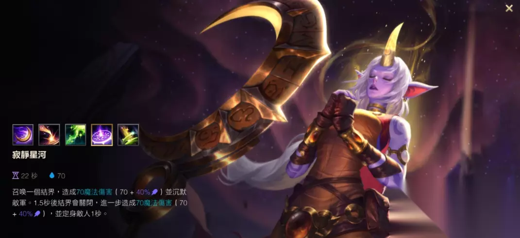 索拉卡的战术价值主要体现在持续治疗和沉默控制领域。Q技能流星坠落命中敌人后可减少W技能冷却时间,W技能星之灌注不再消耗自身生命值,治疗效果溢出时会转化为临时护盾。E技能星体结界能创造沉默区域限制敌方技能释放,大招祈愿可全图治疗队友。这种技能配置使其在持久战和反手保护中更具优势,尤其擅长应对敌方爆发型阵容。