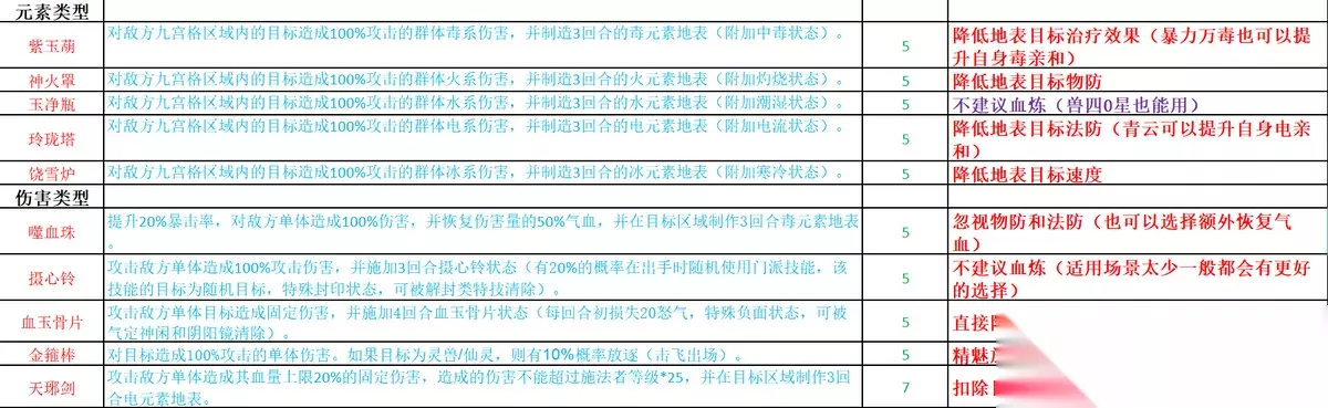 紫玉葫:对敌方九宫格区域内的目标造成100%攻击的群体毒系伤害,并制造3回合的毒元素地表(附加中毒状态)。神火罩:对敌方九宫格区域内的目标造成100%攻击的群体火系伤害,并制造3回合的火元素地表(附加灼烧状态)。玉净瓶:对敌方九宫格区域内的目标造成100%攻击的群体水系伤害,并制造3回合的水元素地表(附加潮湿状态)。玲珑塔:对敌方九宫格区域内的目标造成100%攻击的群体电系伤害,并制造3回合的电元素地表(附加电流状态)。饶雪炉:对敌方九宫格区域内的目标造成100%攻击的群体冰系伤害,并制造3回合的冰元素地表(附加寒冷状态)。伤害类型: 噬血珠:提升20%暴击率,对敌方单体造成100%伤害,并恢复伤害量的50%气血,并在目标区域制作3回合毒元素地表。摄心铃:攻击敌方单体造成100%伤害,诅3回合内有10%的概率使目标随机使用门派技能。血玉骨片:造成固定伤害,使目标每回合失去20怒气,持续3回合。天琊剑:攻击敌方单体造成其血量上限20%的固定伤害,造成的伤害不能超过施法者等级*25,并在目标区域制作3回合电元素地表。金箍棒:对目标造成100%攻击的单体伤害。如果目标为灵兽/仙灵,则有10%概率放逐(击飞出场)。功能类型: