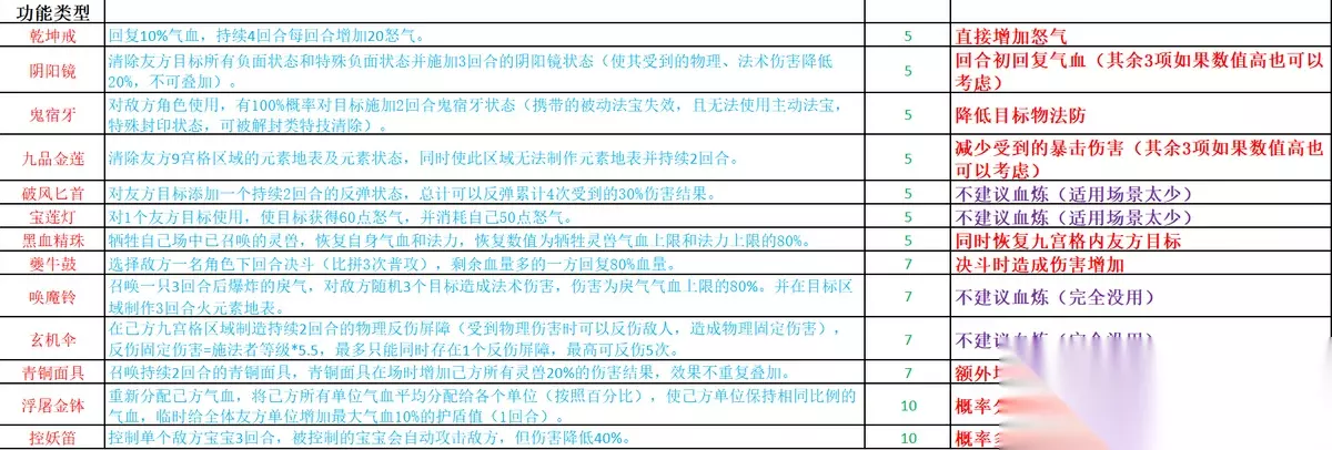 乾坤戒:回复10%气血,持续4回合每回合增加20怒气。 阴阳镜:清除自身所有负面状态,持续4回合使自身受到物法伤害降低20%。 鬼宿牙:对敌方单体目标使用,使之受到的伤害增加5%,并有70%概率附加2回合的鬼宿牙状态(携带的防御型被动法宝青灵镜、六合镜失效,同时无法使用主动法宝)。 九品金莲:清除友方9宫格区域的元素地表及元素状态,同时使此区域无法制作元素地表并持续2回合。 破风匕首:对友方目标添加一个持续2回合的反弹状态(免疫部分伤害同时反弹给攻击者,最大不超过等级*20),总计可以反弹累计4次受到的30%伤害结果。 宝莲灯:对1个友方目标使用,使目标获得60点怒气,并消耗自己50点怒气。 夔牛鼓:选择敌方一名角色下回合决斗(比拼3次普攻),剩余血量多的一方回复80%血量。 唤魔铃:召唤一只3回合后爆炸的戾气,对敌方随机3个目标造成法术伤害,伤害为戾气气血上限的80%。并在目标区域制作3回合火元素地表。 黑血精珠:牺牲自己当前出战的宝宝,恢复自身100%牺牲宝宝气血上限的血量。 千机伞:在己方九宫格区域制造持续2回合的物理反伤屏障(受到物理伤害时可以反伤敌人,造成物理固定伤害),反伤固定伤害=施法者等级*5.5,最多只能同时存在1个反伤屏障,最高可反伤5次。 青铜面具:召唤持续2回合的青铜面具,青铜面具在场时增加己方所有灵兽20%的伤害结果,效果不重复叠加。 浮屠金钵:重新分配己方气血,将己方所有单位气血平均分配给各个单位(按照百分比),使己方单位保持相同比例的气血,临时给全体友方单位增加最大气血10%的护盾值(1回合)。 控妖笛:控制单个敌方宝宝3回合,被控制的宝宝会自动攻击敌方,但伤害降低40%。 如果上述表格或文字中有错误的地方,欢迎小伙伴们提醒指正,关于血炼也可以准备两套方案在不用场景进行切换,有不同意见的小伙伴也可以留言讨论。