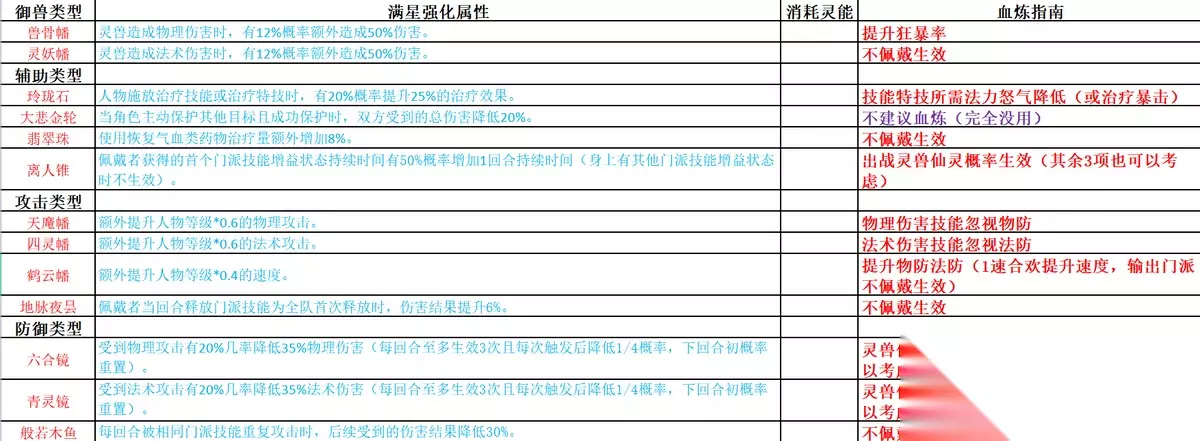 御兽类型: 兽骨幡:灵兽造成物理伤害时,有12%概率额外造成50%伤害。灵妖幡:灵兽造成法术伤害时,有12%概率额外造成50%伤害。辅助类型: 玲珑石:人物施放治疗技能或治疗特技时,有20%概率提升25%的治疗效果。大悲金轮:当角色主动保护其他目标且成功保护时,双方受到的总伤害降低20%。翡翠珠:使用恢复气血类药物治疗量额外增加8%。离人锥:获得门派技能增益状态时有50%概率增加1回合持续时间(身上有其他门派技能增益状态时不生效)。攻击类型: 天魔幡:额外提升人物等级*0.6的物理攻击。四灵幡:额外提升人物等级*0.6的法术攻击。鹤云幡:额外提升人物等级*0.4的速度。地脉夜昙:佩戴者当回合释放门派技能为全队首次释放时,伤害结果提升6%。防御类型: 六合镜:受到物理攻击有20%几率降低35%物理伤害(每回合至多生效3次且每次触发后降低1/4概率,下回合初概率重置)。青灵镜:受到法术攻击有20%几率降低35%法术伤害(每回合至多生效3次且每次触发后降低1/4概率,下回合初概率重置)。般若木鱼:每回合被相同门派技能重复攻击时后续受到的伤害结果降低30%。主动法宝: 元素类型: