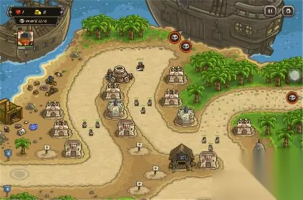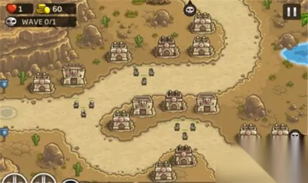 难度:VETERAN 模式:HEROIC 英雄:无 道具:小炸弹若干应急 攻略:本关的重点在于死守中央路口,初始布局建议左侧弓箭塔,魔法塔;中下部弓箭塔,炸弹塔;右侧弓箭塔;中部步兵塔,弓箭塔(参考图片一)。有资金后在中部补充1座弓箭塔,1座步兵塔以稳固中央防守,增援还是冷却就用。然后升级,本关的塔可以升1级,优先升级中央的步兵塔,然后是左侧的魔法塔,再后是中央的弓箭塔和中下的炸弹塔。本关二级沙漠兵较多,在其于中央集中时用火雨。后期可酌情在后方补箭塔,总的来说本关难度不大,我通关时还有600多金