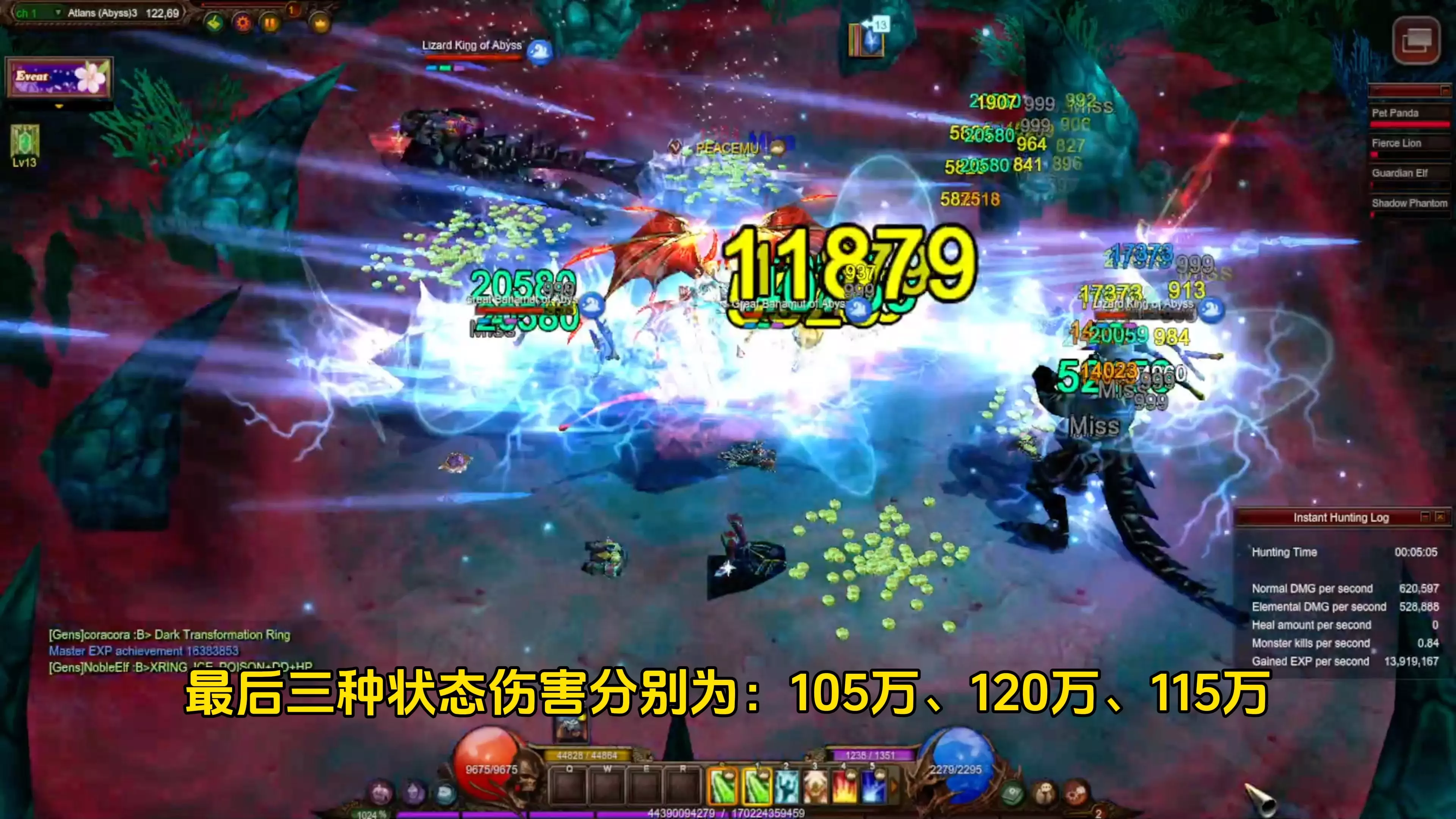 这是奇迹MU国际服S20-2的游戏内容,展示了红战职业单刷火山地图的过程,画面中可见角色战斗时的高额伤害数值、掉落的金币,还展示了角色属性面板与装备,呈现出该职业单刷的战斗表现。