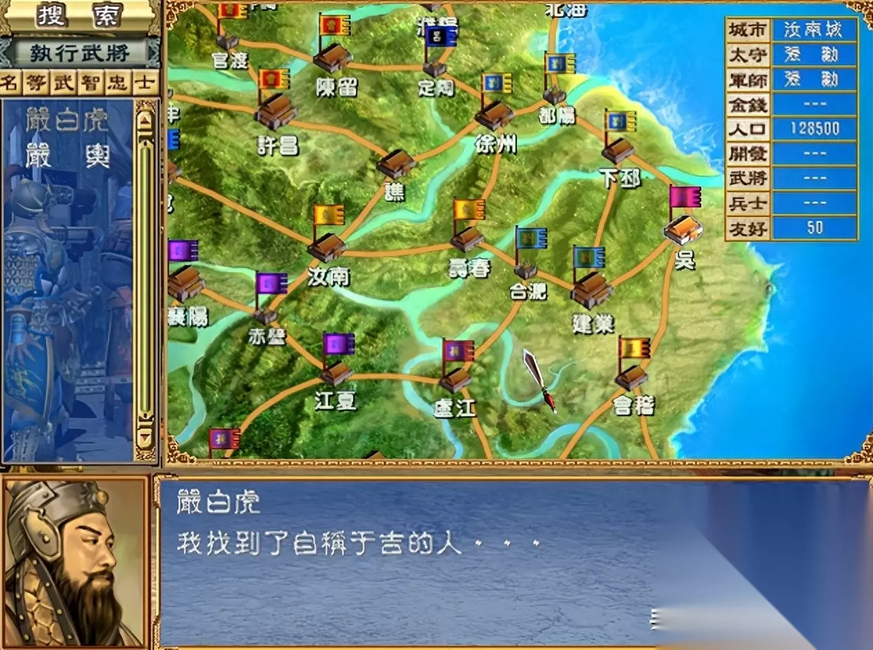 什么金旋飞凉州,严白虎飞南蛮,孔融飞辽东,都是可以一键搬家的。当然这要建立在离间之上,必须确保你要离间的对象是驻扎在目标城市里唯一的守将,他归顺你就会附带整个城市的改旗易帜。原则上建议金角银边,小势力要尽可能搬到旮旯缝里,才能安逸的猥琐发育。 三:原地搜索。
