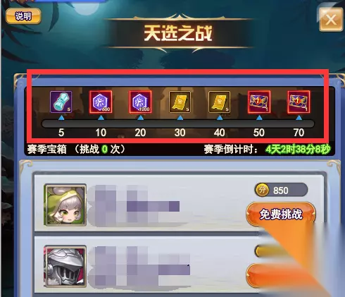 该玩法一个赛季持续7天,每天20点根据排名结算每日奖励,而每周日20点则根据排名结算赛季奖励,均通过邮件发送。另外提醒一下,每周打满5、10、20、30、40、50、70次都有一个赛季宝箱奖励,在上方进度条领取。