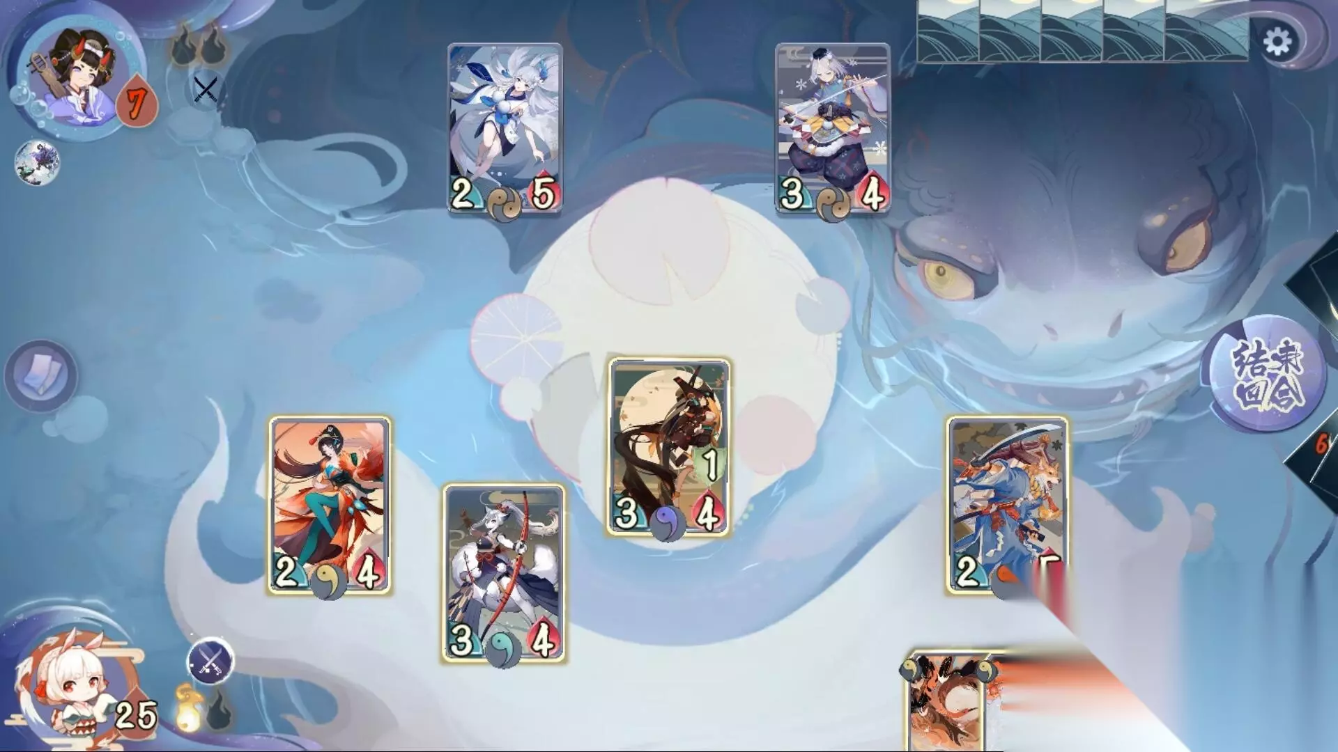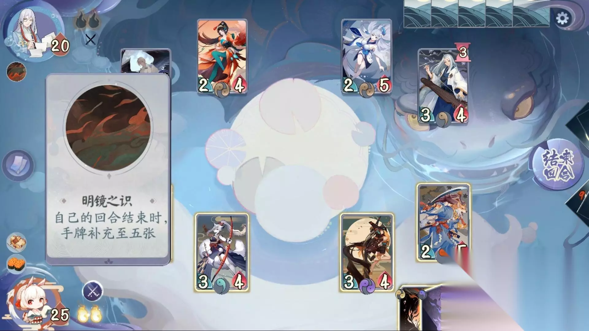 第五关:对战书翁 敌方生命值:20 敌方式神:大天狗 凤凰火 雪女 妖琴师 敌方技能:明镜之识 技能效果:自己的回合结束时,手牌补充至五张。 第六关:对战觉 敌方生命值:25 敌方式神:桃花妖 姑获鸟 妖刀姬 萤草 敌方技能:战斗专精 技能效果:回合开始时,获得鼓舞:+1/+1。