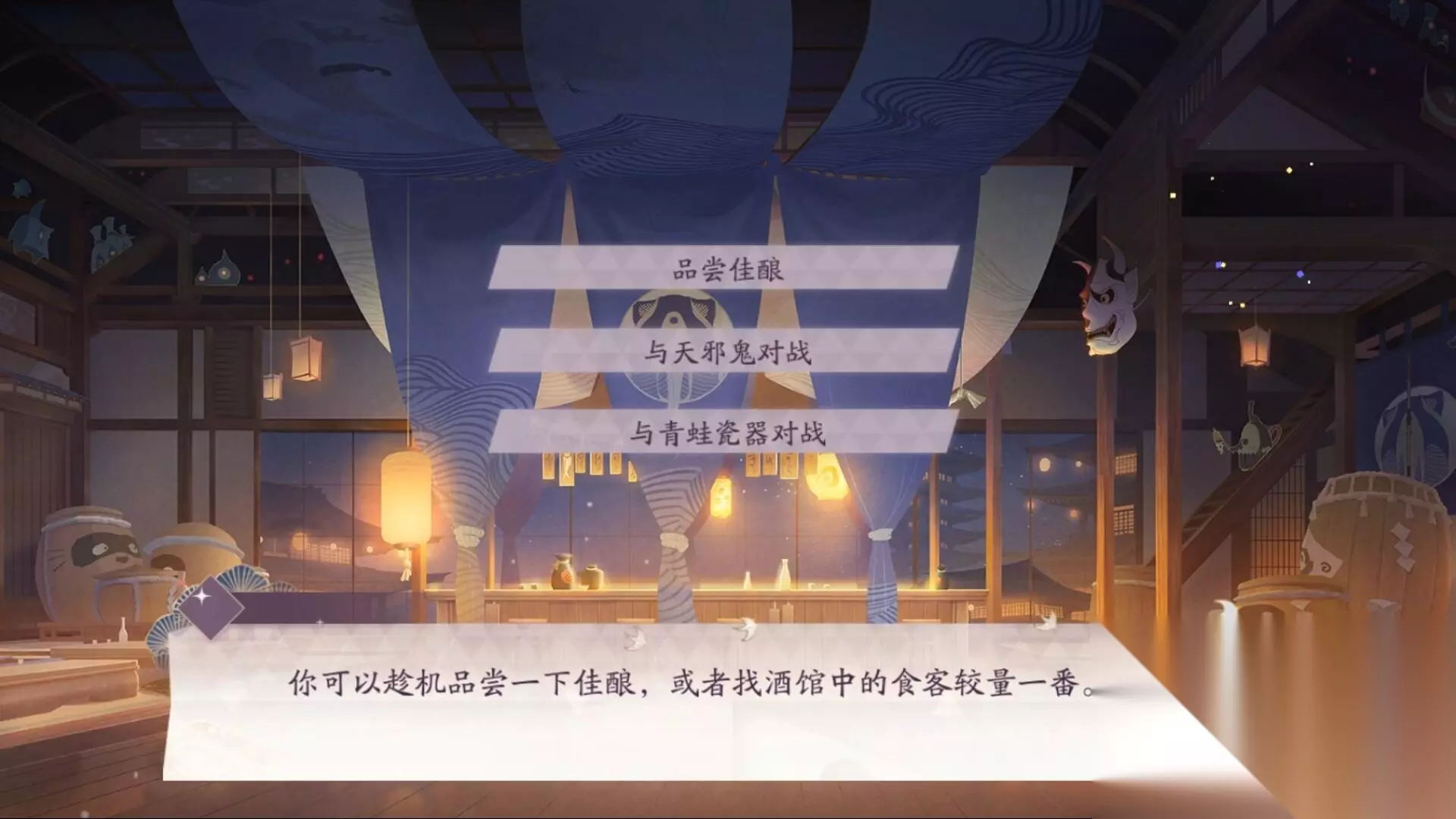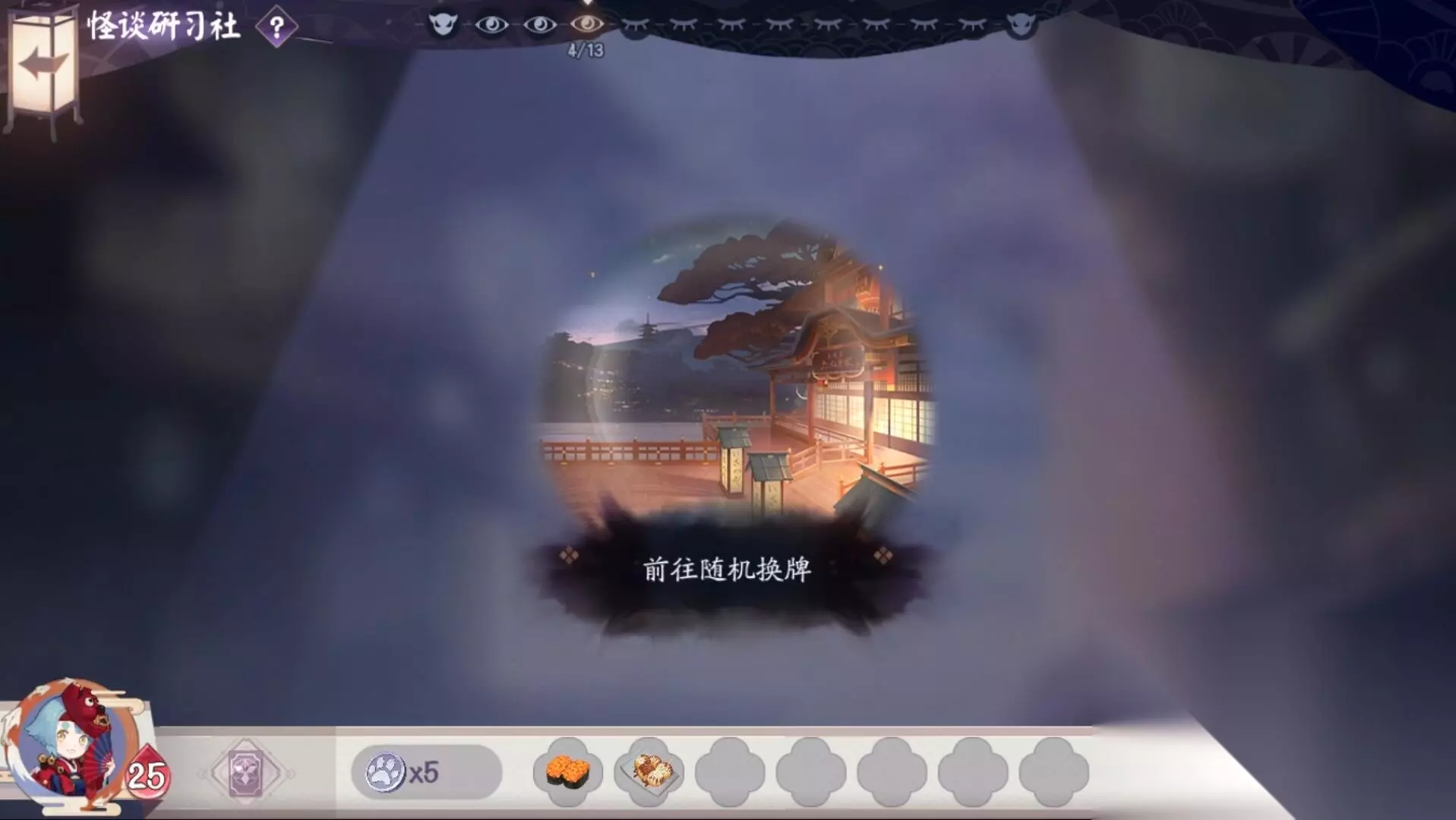 第七关:换牌机会/青蛙瓷器的隐藏房间,还有可能前往狸猫酒馆 客人在狸猫酒馆内可以做一次三选一。 品尝佳酿会增加10点生命上限;选择与天邪鬼对战并获胜可以升级一次式神;选择与青蛙瓷器对战并获胜可以获得一张卡牌。 第八关:对战觉 敌方生命值:25 敌方式神:桃花妖 犬神 兵俑 妖琴师 敌方技能:威胁恫吓 技能效果:己方式神气绝时,随机对敌方式神造成1点伤害。 第九关:商店/狸猫酒馆/青蛙瓷器的隐藏房间 第十关:对战镰鼬一太郎(固定) 敌方生命值:25 敌方式神:山兔 大天狗 鸩 妖琴师 敌方技能:再动 技能效果:每3回合,使己方所有式神倒计时-3。